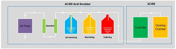 In response to the risk of a room full of toxic fumes, the AC400 is equipped with Amerlab's proprietary acid vapor scrubber. The acid vapor is condensed, collected, neutralized, online pH monitored and alkaline sorbent neutralized before being discharged. With this device, the AC400 does not need a fume hood.