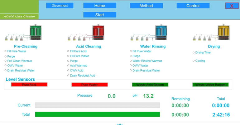 Once the low level of pure acid or water is detected, the cleaner will remind you to refill it before starting to prevent inadequate cleaning. Once the high level of waste is detected, the cleaner will not allow you to start the cleaning to avoid overflow.