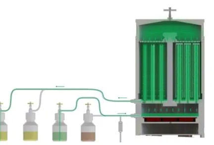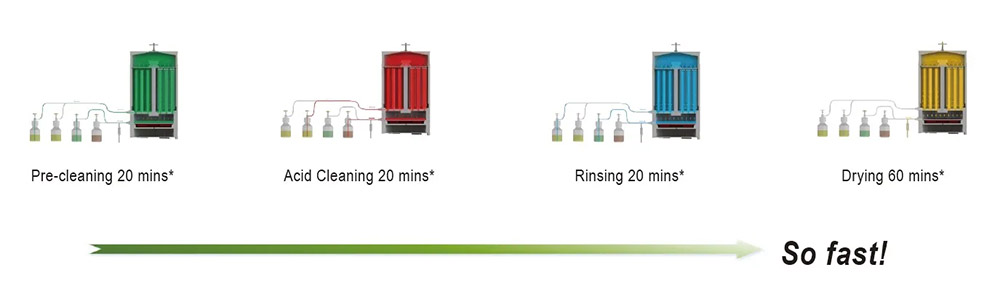 The microwave rapidly warms up the acid liquid and generates a large amount of acid steam to clean the vessels' inner and outer surfaces. Thanks to the OWV technique, the used acid is drained automatically and never reflux to contaminate the clean acid liquid. Upon finishing, the remaining acid will be drained from the system automatically.