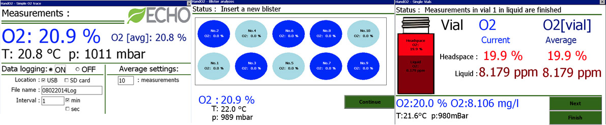 Hand O2 is used for determination of headspace and dissolved oxygen content in packages. Micro-invasive measurements are enabled by sensor tips smaller than 140 µm. Main application is packaging quality control in pharmaceutical food and beverage industry, i.e., measuring oxygen concentration in blister packs, vials, tubes, and other modified atmosphere packaging technology.