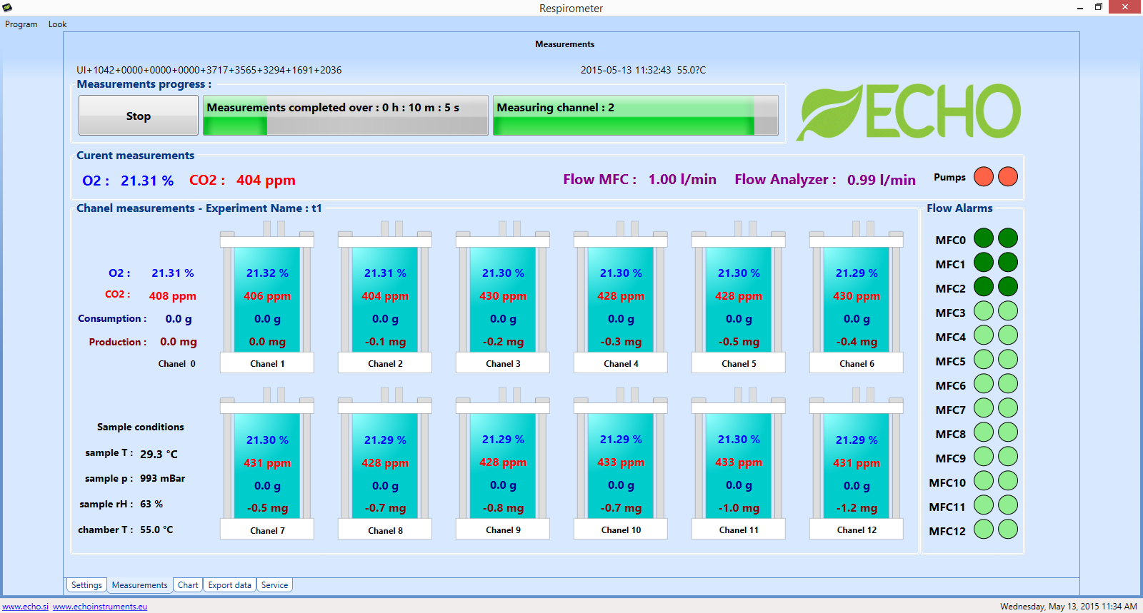 Respirometer measures O2 and CO2 concentraon in flow through the sample under controlled condions. Addional gases can also be measured.